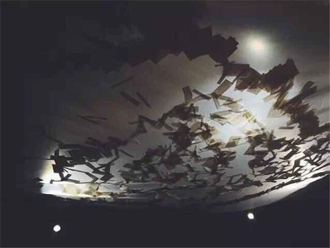 此次徐升老师参展的作品有《图书馆与天堂》、《穿透》、《流动》等。其中《图书馆与天堂》以抽象化的手法处理各种丰富材料和展现对空间的体验,他把《博尔赫斯谈话录》拆分成一页页,按阅读顺序贴满展墙,用徐升老师的话说,“这是一面可呼吸的墙”。作为一个艺术项目之外,徐升老师向大家展示了这种艺术与知识结合的先进理念,在大家看到艺术品的同时又能感受知识的力量。