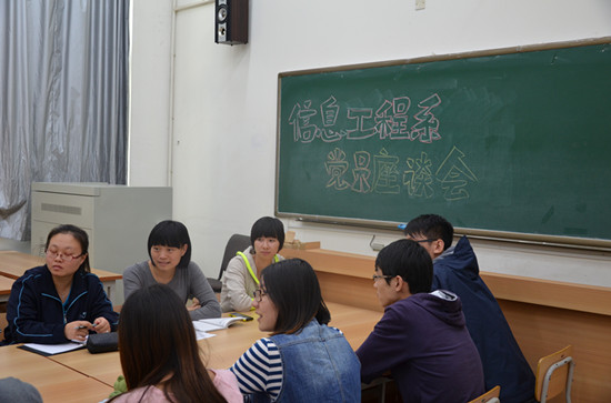 十八大即将召开之际,为进一步了解学生党员在学习生活中发挥先进性的实际情况,树立党员旗帜,学院党总支郭颖副书记、党支部杨艳书记、团总支钟道书记以及信息工程系全体学生党员于10月10日下午进行了座谈。