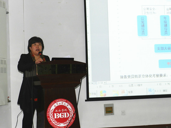 郭颖副书记结合党的四风教育对群众路线工作的要求,向同学们介绍了今后我院学生党员发展的立体化考核体系。思想上追求先进,有志加入中国共产党的同学可向公寓辅导员递交入党申请书,公寓辅导员和年级辅导员根据学生在宿舍和课堂的综合表现确定是否推荐参加党课学习,党课学习合格确定为入党积极分子,之后通过党课提高班和实践参观调研,发展重点积极分子,经过年级辅导员、公寓辅导员以及入党培养人的进一步考察,于所在班级进行民主测评,形成团支部决议,通过确定为培养对象后进行公示,之后在支部发展大会上讨论,由上级党组织派支委与学生谈话,经上级党组织集体批准后,确定为预备党员。郭颖副书记强调,今后将加大党员发展过程中的集体考察指标,加大民主测评的权重,被发展的同学要有扎实的群众基础,能够起到较好的模范带头作用。
