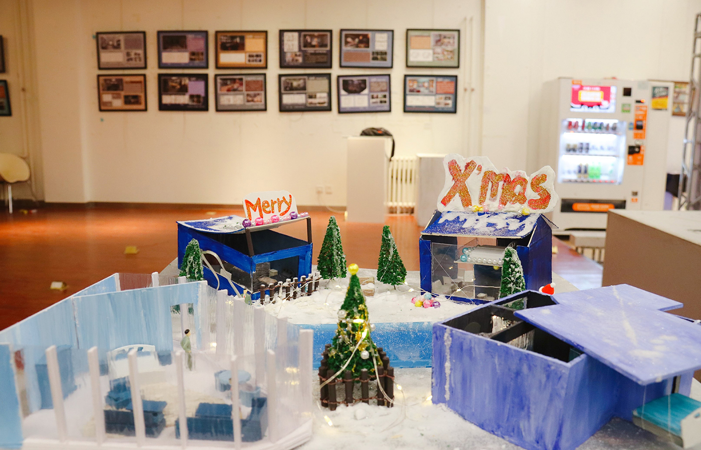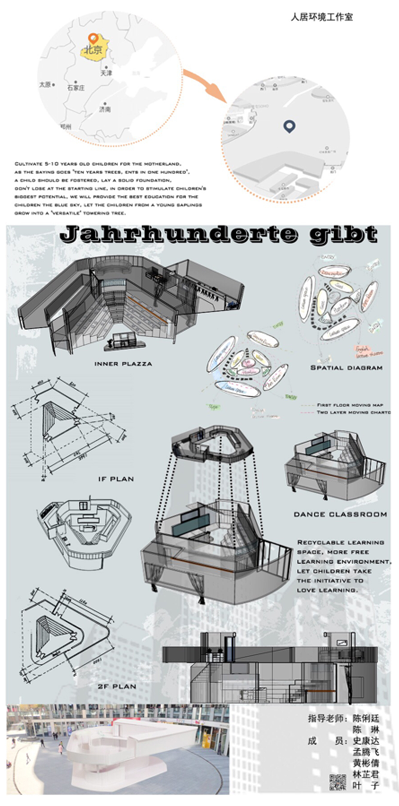 In the early stage of the design, students did the research and analysis of the target group of people, base site scale, lighting, surrounding buildings of Sanlitun space, and designed the plan and drew sketches under the guidance of teachers.Through a series of drawings, such as site analysis map, bubble map, mind map, plane layout map, analysis map of target group, the students determined their own plans and design focus. And they began model making, SU effect modeling, exhibition board making and H5 production.