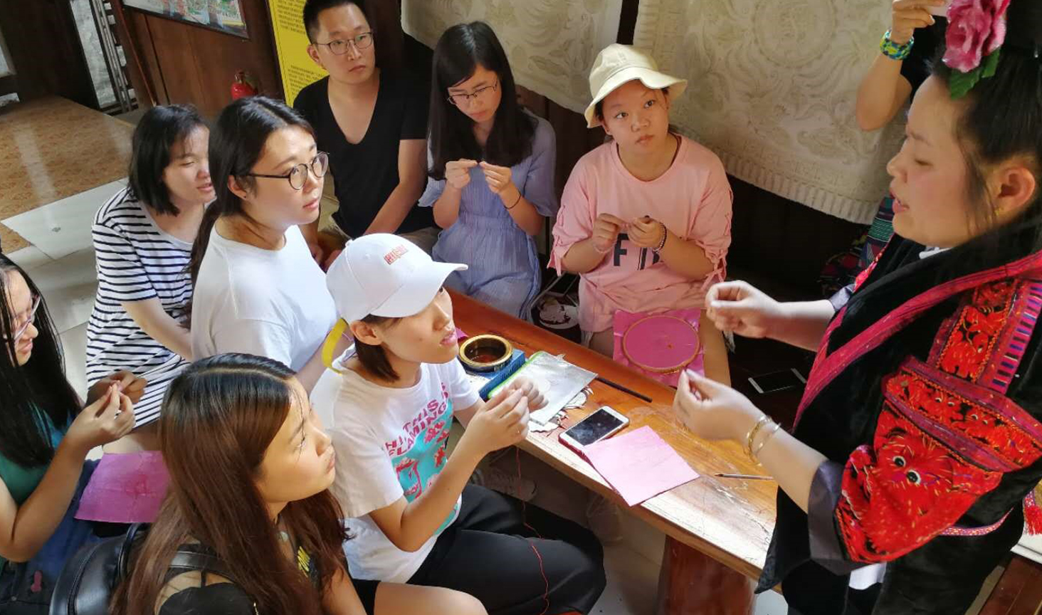(学生们和当地绣娘学习苗绣)