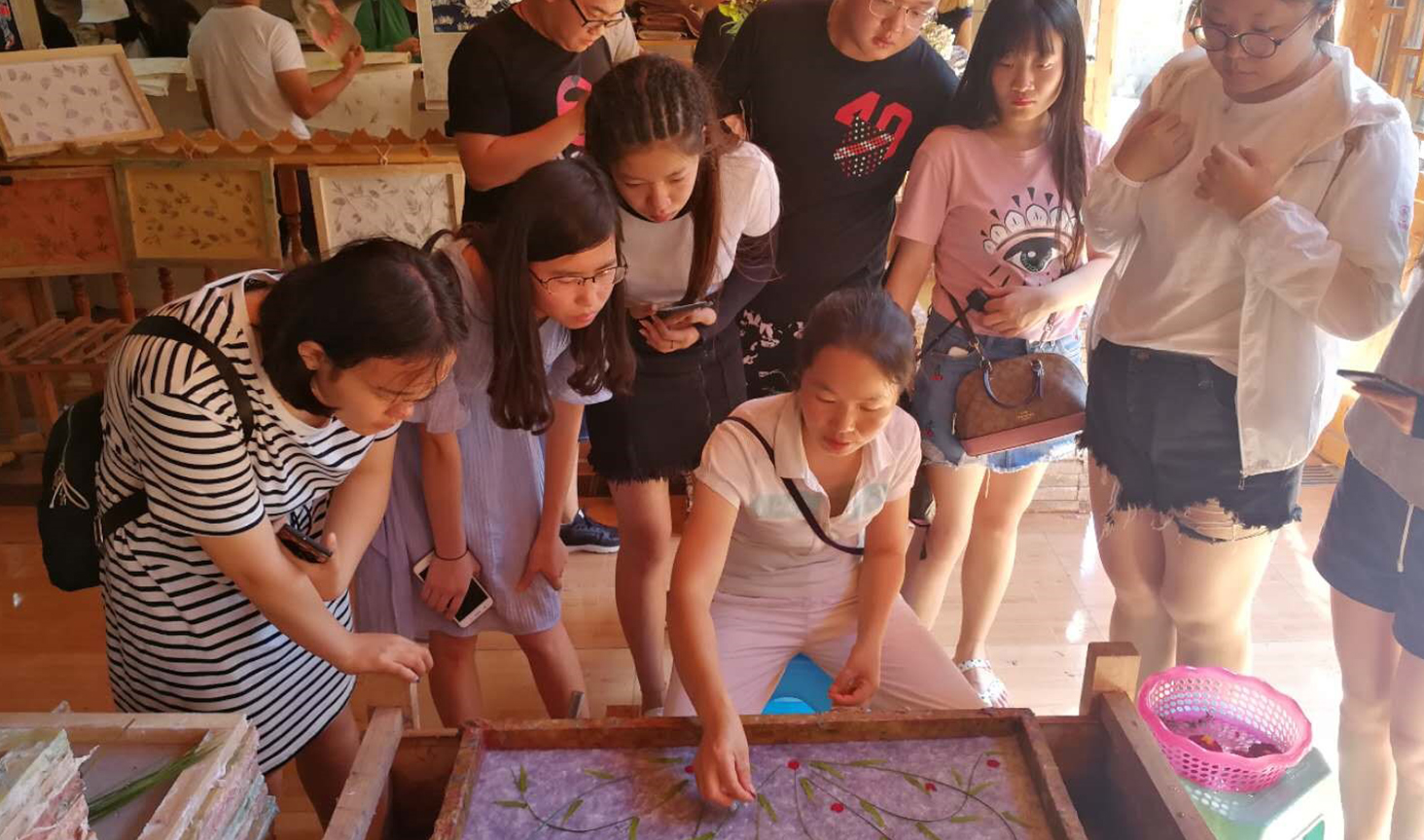 (学生们观摩手工纸的制作流程)