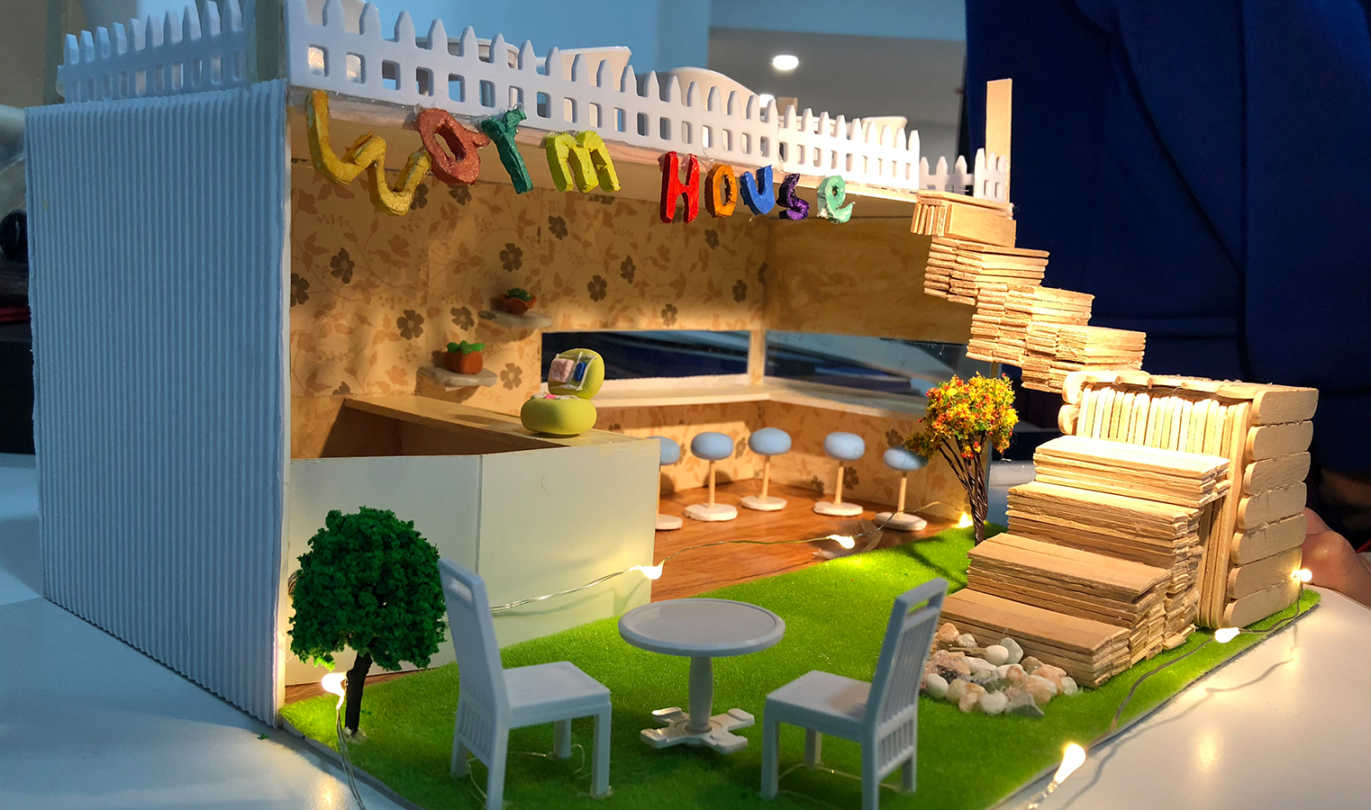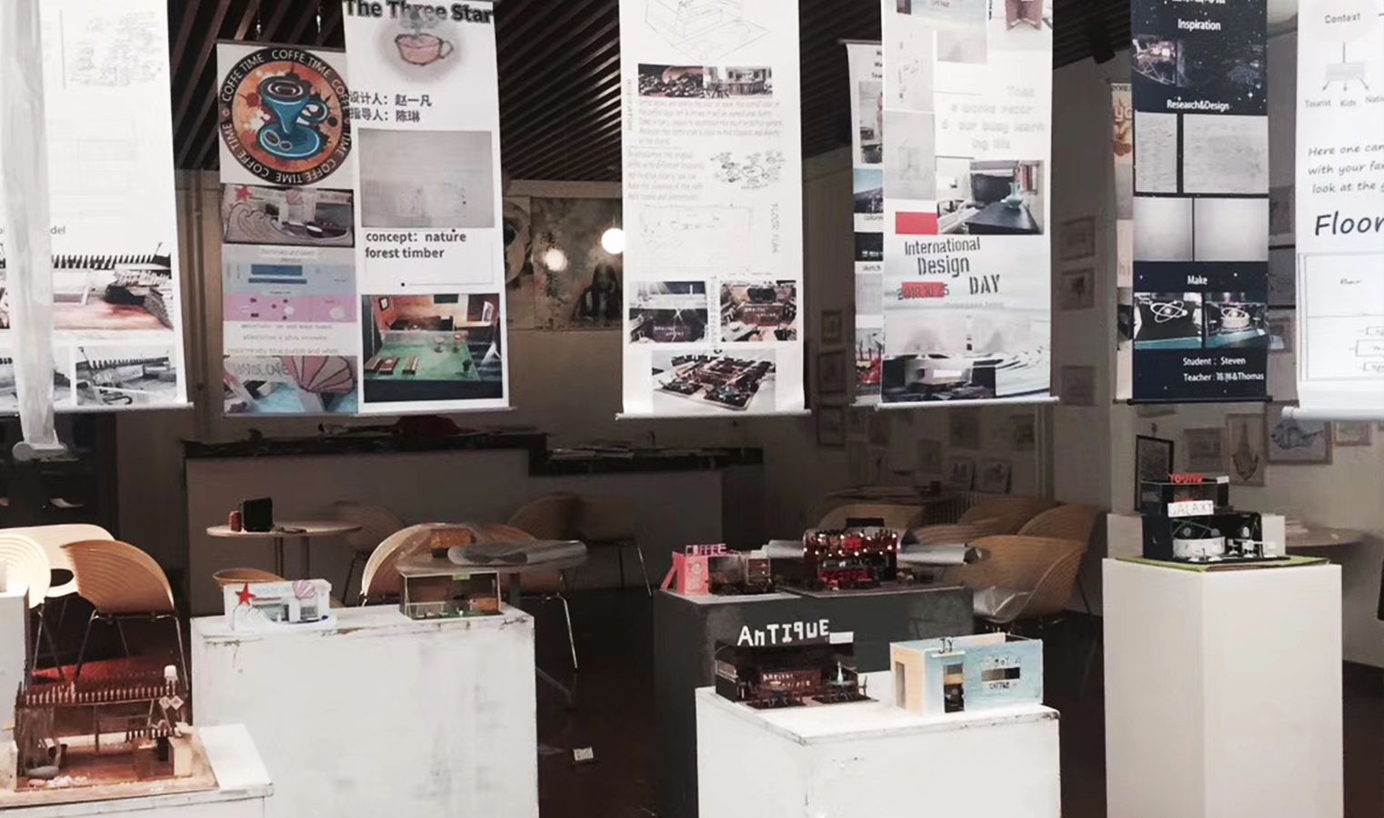 This exhibition features in the transformation of containers into cafes. It needs students to creatively decide on the theme by a consideration of space, function, proportion and targeted customers, and then complete the design scheme by the use of bubble diagram, sketch, floor plan, vertical plan, artist’s impression and scale model. Through this course, students get to learn creative design, sketching, abstract thinking, modeling and PS-aided exhibition board designing, etc. Thanks to the integrated teaching of English courses and major-related courses, students’ English abilities have been enhanced so that all of the student works and reports could be presented in full English. We have seen significant changes in many students from only able to say isolated words at the interview upon the beginning of this semester to confident enough to make full English presentation now, which proves the saying that “there are no limits to what you can accomplish, except the limits you place on your own thinking.”
