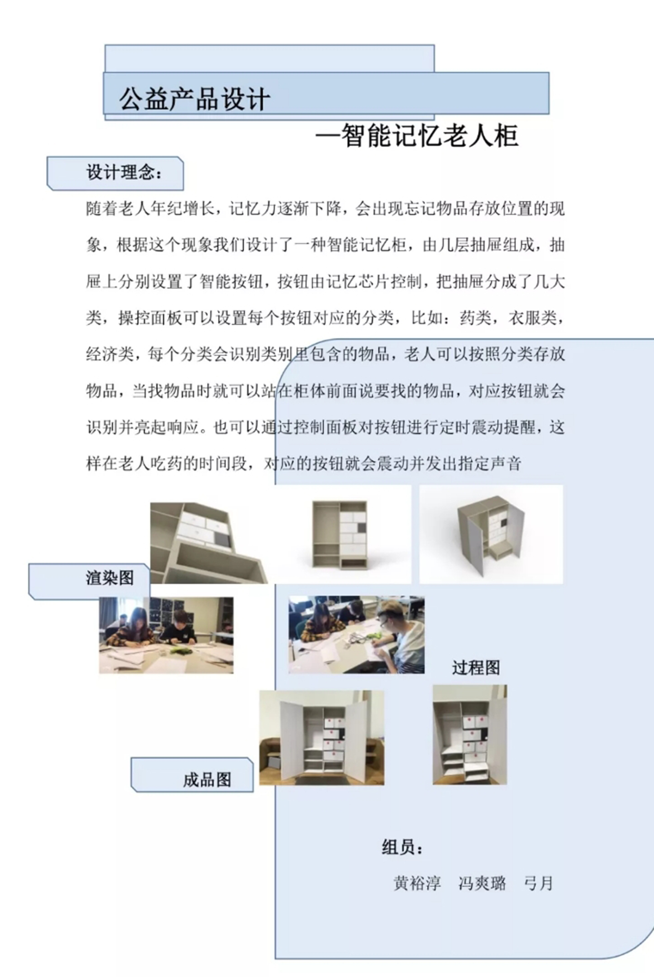 This course is based on the trend of population aging in China and the world, under this circumstance, the society is facing the enormous challenges and stresses brought from this issue. Through relevant public welfare product design case analysis, academic knowledge explanation, assignments exercises and etc.,students are guided to study the life style and demands of the elderly and design the relevant products. The students surveyed a sufficient market research on the products for the aged and then established the design theme. After many revisions of the project, they made a series of products which can improve their quality of life.