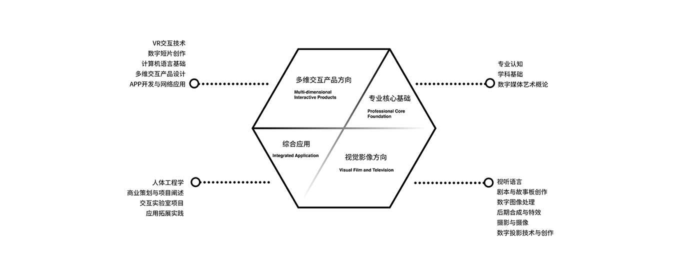 数字媒体艺术现开设“多维交互产品”、“视觉影像”两个专业方向,与工学院数字媒体技术专业联合交叉建设。基于“互联网+”的商业模式,培养学生具有数字科技与艺术创意的整合营销能力、以用户体验为中心的交互设计与策划能力、综合运用艺术表现手段与媒介进行数字娱乐与传播的创意能力。目标要培养学生在数字媒体领域中具有综合优势的艺术创新人才。
