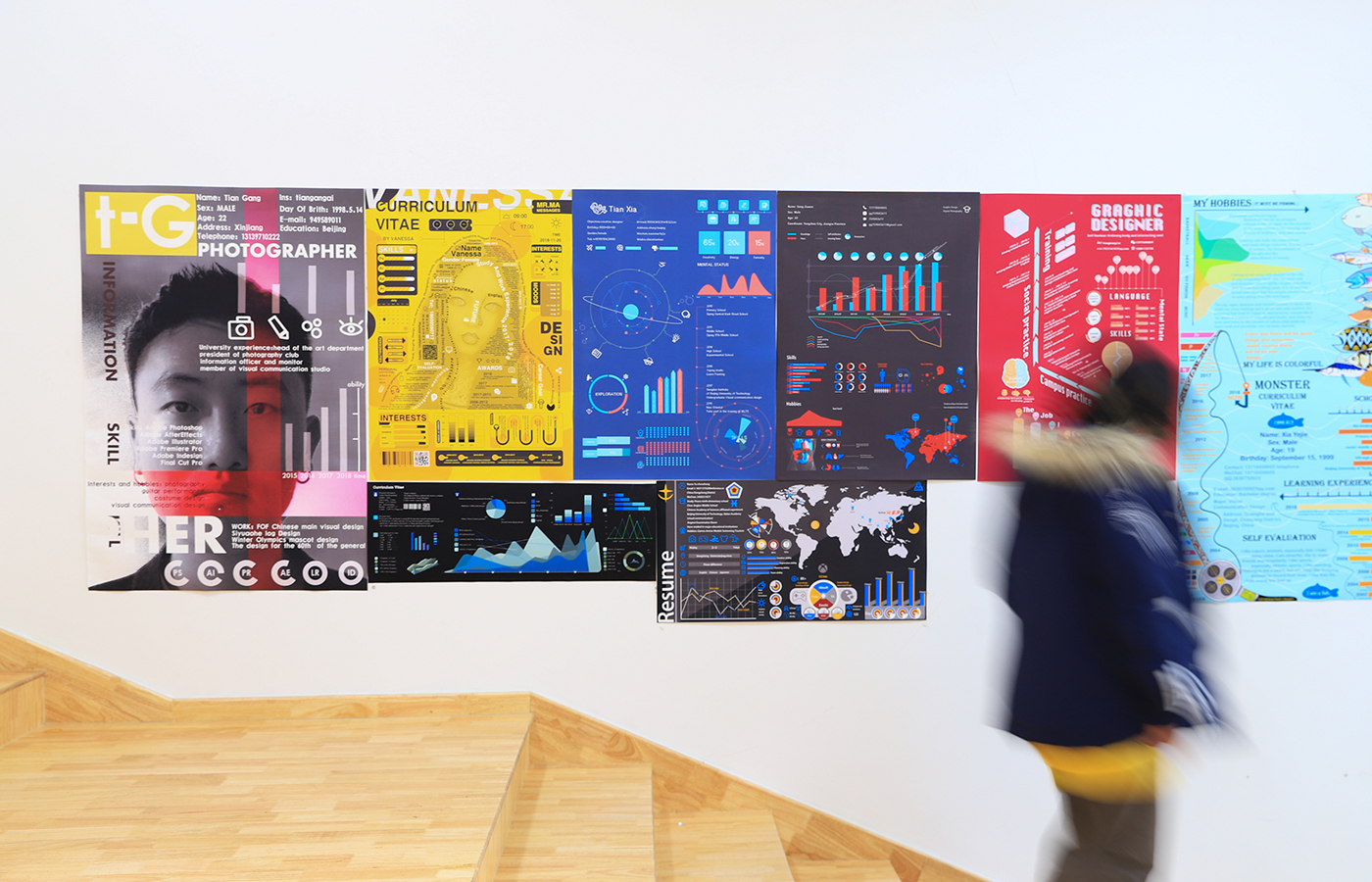 课程中三次汇报,夏岩枫老师对学生们不同阶段的作品进行了指导,使同学们对视觉个人简历和信息图表的理解逐渐深入。学生们布展后进行了总结汇报,介绍了各自的设计理念和创意来源。这次课程让同学们学习到视觉图形的表达和运用,不仅使同学们的设计思维更加成熟与缜密,同时还提高了眼界与设计水准。