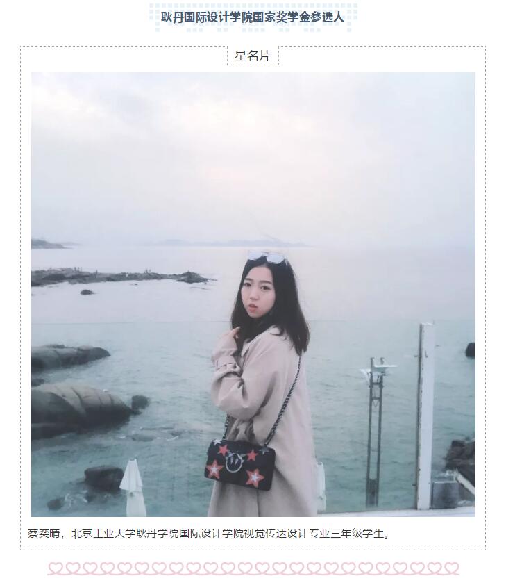 蔡奕晴:我始终牢记学习是学生的天职,始终坚信自己的信念:“既然选择了远方,便只顾风雨兼程。”功夫不负有心人,在老师的指导下,多次参加各项比赛并有所收获。参加全国大学生广告比赛,获得优秀奖;参加青年摄影网青年摄影大赛获得优秀作品奖;参加院内校园卡设计比赛,参赛作品分别获得二等奖和三等奖;参加人文学院英语文化节暨英语书法比赛获得三等奖。并且在不久前参与两岸新锐设计竞选・华灿奖的比赛。这些竞赛使我的专业水平有所提高,不仅开阔了我的眼界,同时也为我的设计研究打下了坚实的基础。