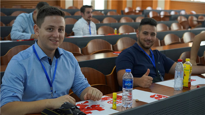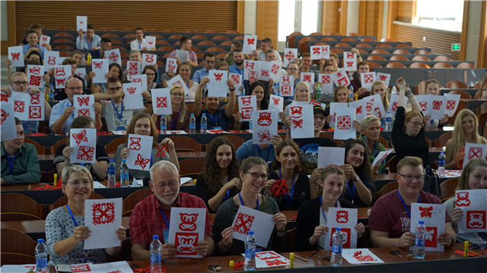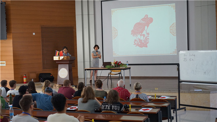 下午,来自北京国际汉语学院的两位老师,为德国师生分别进行了《剪纸》和《中国结》课程,课堂上,两位老师先简要为德国师生介绍了中国传统艺术知识、展示艺术作品,随后,就带领学生们动手操作,在剪纸课堂,学生们完成了熊猫、蝴蝶及窗花等剪纸作品;在中国结课堂,大家学会了用五颜六色的丝线编制平安扣手链。德国师生们学习得很快,动手能力也很强,当看到经过自己动手,完成的剪纸和中国结作品,大家都非常开心。