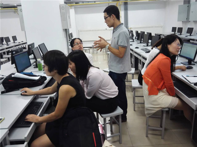 王洋老师给现场老师们演示了微信考勤系统的操作步骤,从信息注册、开启课堂到添加学生都进行了逐一的讲解和示范,随后,王洋老师又对耿丹混合学习系统的操作进行了一一演示,从选课到设置密码,再到调查问卷、上传作业等,王洋老师对系统每个环节都进行了耐心细致地讲解,现场老师听得非常投入,并跟着认真地演练,积极提出自己的问题。王洋老师讲解结束之后,老师们自己在电脑上操作练习,相互之间积极的讨论、交流和学习,课堂气氛十分活跃。