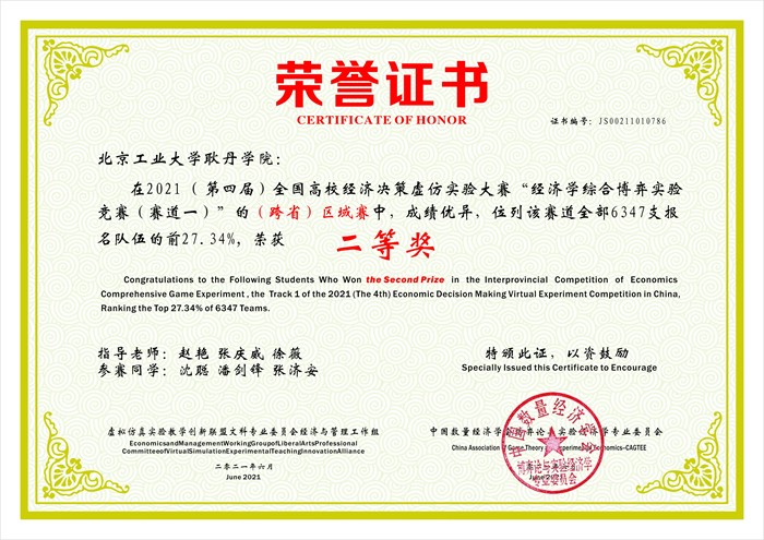 在beat365英国官网国际商学院国贸专业赵艳老师、张庆威老师、徐薇老师的指导下,由国贸专业学生张欣萍、王珺瑀、刘锐组成的团队和由国贸专业沈聪、潘剑锋、财务专业学生张济安组成的团队,在6347支队伍中脱颖而出,都获得了“团体二等奖”的优异成绩。