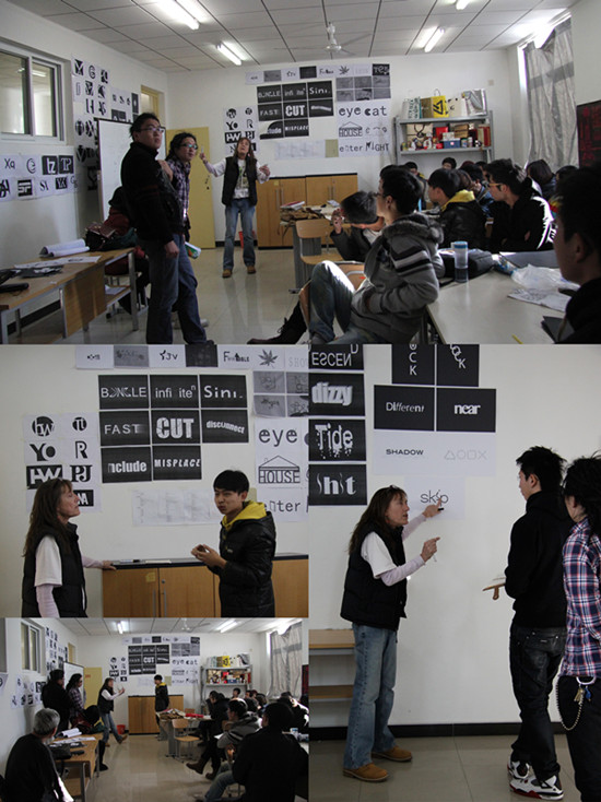 Kathy教授目前在我院开设的第一门课程是48课时的字体设计。在过去三周里,通过理论讲授、演示、作品讲解互动等授课方式,提升了学生的设计思维能力以及解决如何切入设计问题的能力。同时,Kathy教授采用国外轻松活泼的教学模式,更注重教师与学生的交流互动、学生与学生的交流互动、从多方面多角度的交流沟通中帮助学生更深刻的理解知识、从互动中理解设计、从设计中学习语言,使同学们不仅学习了相关专业方面的知识,同时英语水平也得到了提高。新颖的教学模式和沟通方式使同学们进一步认识了设计,对专业知识加深了理解,也对英语提升了兴趣。每位同学在讲解设计方案时都力争用英语表述,表达时经常用动作补充语言的不足,课堂上笑声不断,同学们都对此次课程充满了参与热情。