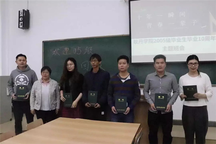 上午十点,在B102教室举办了主题为“十年一瞬间,青春一辈子”2009届毕业生毕业生10周年主题班会,来自海南、云南、北京的24位2005级同学和当年的部分老教师参与了活动。班会上,05级辅导员老师薛美慧回忆了当年同学们的学习、工作和生活,并将当年的成绩单作为礼物发放给同学们;工学院李京增副院长、通识教育中心李晓鹏老师代表教师发言。当年在耿丹工作的部分老教师也参加了活动。