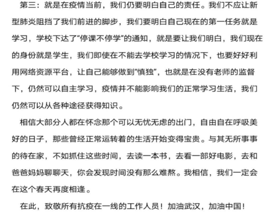 王未晨同学总结了在疫情期间应该严格听取党中央的号召,从自身做起减少外出,拒绝聚众,并且相信坚守就是胜利。