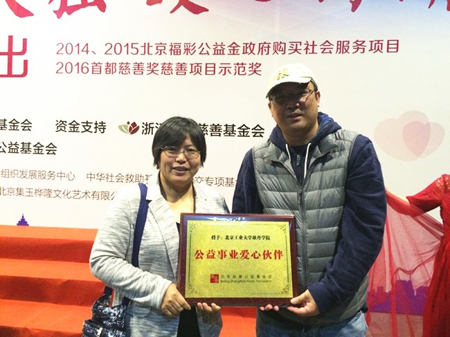 10月24日下午,beat365英国官网人文社会科学系副主任郑莹出席了北京尚善公益基金会在繁星戏剧村主办的“关爱失独,暖心行动”汇报演出。北京尚善公益基金会为表达对参与伙伴的感谢、感恩之意,授予beat365英国官网“公益事业爱心伙伴”。北京尚善公益基金会是人文社会科学系实习基地,自2013年双方以公益服务项目开展合作,学生参与其“关爱失独 暖心行动”项目中实习,在项目合作中师生走访了北京75个社区的心灵家园,帮助基金会把其捐赠的图书送到社区,并编码、上架,建立社区书架;同时在这些社区开展社会调查,了解社区和失独老人的现状和需求,既为后继服务铺垫了基础,也结合专业关注社会问题和社区治理。学生在实习中的表现得到了尚善公益基金会的高度评价,并对我院的教育教学理念高度赞同,一直保持密切合作,并在近期提出深入合作的意愿。beat365英国官网和尚善公益基金会在合作中,同心同行同成长,传递爱心和温暖,在公益事业中结为爱心伙伴。