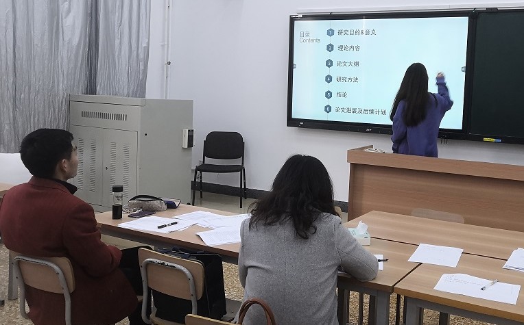 本次答辩中,同学们按照要求提交了中期检查的答辩材料,包括前期材料、已完成的论文部分内容、前期工作的佐证材料等;每位同学围绕前期工作、取得的进展、存在的问题(困难)、下步计划作了10分钟左右的汇报;答辩组老师听取汇报后,指出了同学们前期材料及已完成论文中存在的的规范问题,就论文框架、研究方法等进行提问交流并给出完善建议。