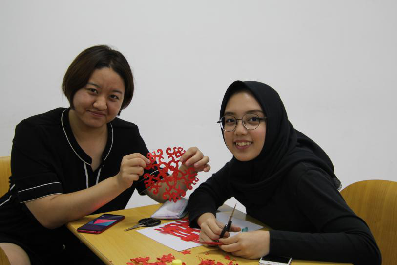 在剪纸、中国结等手工课程教学上,同学们也是丝毫没有懈怠,创新加教学,带领留学生们切身体会中国的指尖艺术并完成了属于自己的作品。