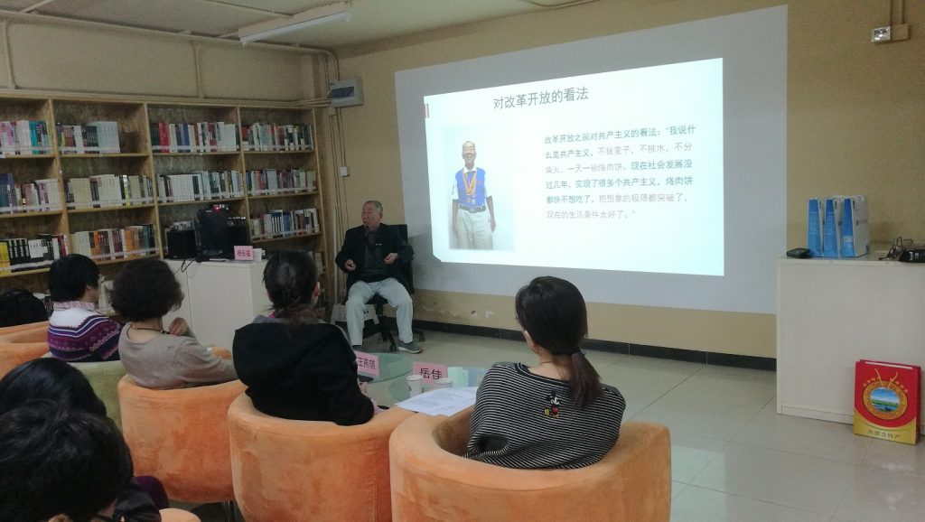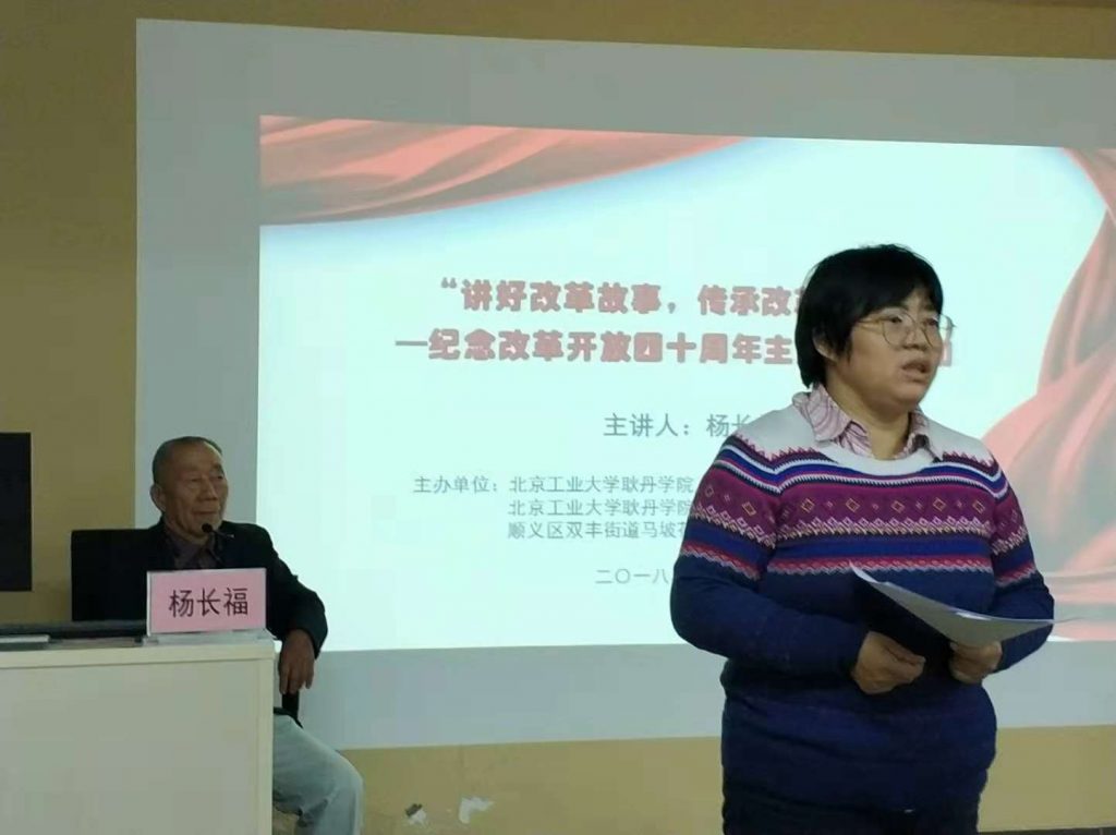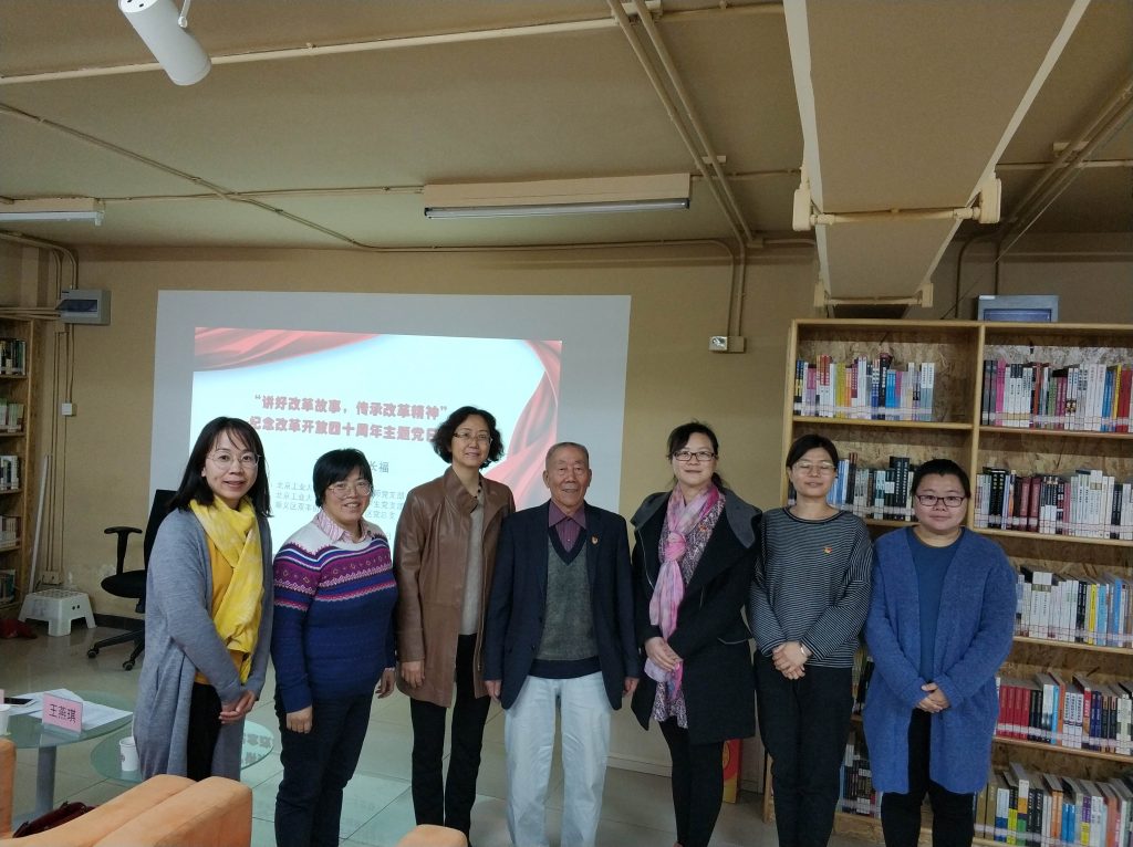 人文学院专业教师党支部书记郑莹主持了本次活动,介绍了活动的目的和意义。改革开放给个人命运带来了巨大的转变,经历了国家和社会历经翻天覆地变革的时代,其个人的经历也折射时代变迁和改革开放的历史。通过作为历史亲历者的老党员个人人生历程的讲述,能够更加生动形象地展现改革开放四十年来的光辉历史,让40年众志成城、40年砥砺前行的改革和发展的历史更加深入人心。
