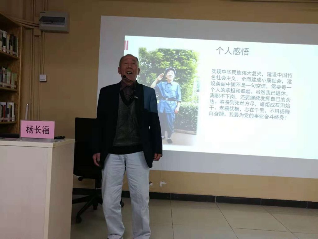 本次活动邀请了马坡花园二期社区党支部的老党员杨长福同志分享自己一生的经历,把改革开放四十年来的伟大变革结合个人切身体会,以故事的形式和大家分享。故事的结尾,71岁的杨大爷充满激情地说到:“实现中华民族伟大复兴不是一句空话,我要为党的事业奋斗终生!”并满怀深情地献上一曲“时间都去哪了”表达自己一生为共产主义事业奉献的真挚情感,感动了现场所有师生。