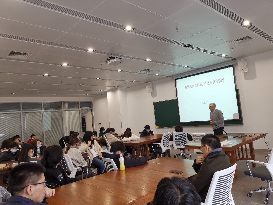 在讲座过程中,胡万里老师从“知识的力量,与相应的社会变迁”开讲,用“现代管理学之父”德鲁克大师的生平故事及研究历程为主线,生动地与参加讲座的同学们探讨了知识工作者主题内容。胡老师主要谈及:西方发达国家在20世纪50年代、60年代相继步入了后工业化/后资本主义社会,也就是知识社会。中国在1999年高校扩招后,也有了越来越多的知识社会的因素。一个国家国力的强弱将直接取决于知识工作者生产率的高低。在知识社会里,知识工作者与其服务的组织的关系发生了哪些变化?知识工作者有什么样的特点?知识工作者如何取得绩效?如何做好自我管理,如何健康成长,如何获得人生意义?这正是我们每一个知识工作者要必须考虑的问题。此外,胡老师鼓励大家结合各自的专业去理解知识工作者对自己的管理,以利于激发更多的知识创造力量和社会服务动力。