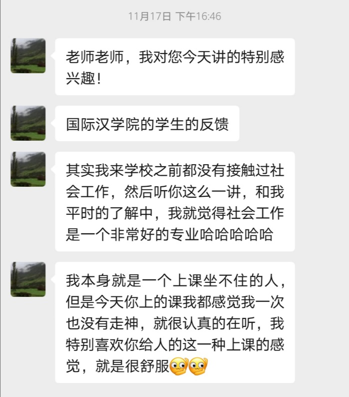 在互动交流环节,同学们兴致勃勃地和胡老师讨论了大学的专业、知识工作者、工业化、大学生发展等话题。在讲座结束后,国际汉语教育的一名学生迫不及待的给老师发来了真实的讲座受益反馈,从学生微信致谢的字里行间可以看出:关于知识传授,对于学生自己感兴趣的内容,他们的专注力是会自然投入且比较持久的。
