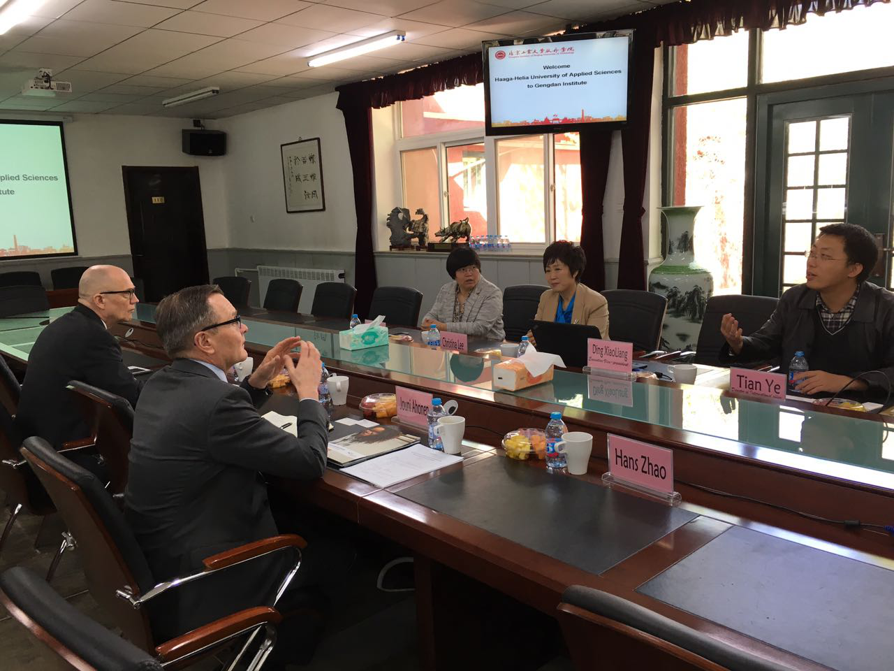 耿丹国际常务副院长丁晓良向来宾介绍了beat365英国官网学院教育理念、改革思路和未来发展规划,国际合作交流中心主任田野介绍了我院基本情况,特别是详细介绍了我院学生参与国际交流项目学习的情况。芬兰哈格-赫利尔应用科技大学副院长Jouni Ahonen介绍了该校开设的专业,来中国寻求合作的项目等。人文社会科学系主任李洁介绍了人文系的两个专业,讨论了基于两个专业多个培养方向的合作,并且可以拓展到更多专业,对国际实习项目也深入进行了交流。