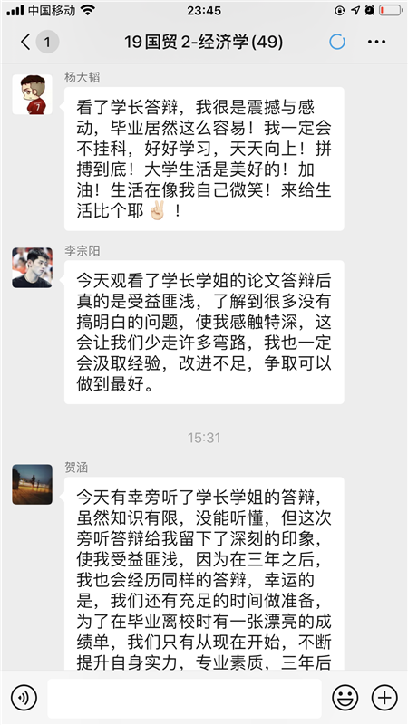 答辩结束后,同学们还在班级群进行了热烈的讨论,发表的感想达三万字之多。同学们认为大四学长学姐们在答辩时,清晰的思路、严谨的态度、详实的论证、正式的着装都令他们大为惊叹。同学们纷纷表态一定要认真学习专业课,未来也可以像学长学姐们一样运用更多的专业知识进行论文答辩。同学们表示旁听了这次答辩之后,对今后的学习有了更明确的目标,去努力、奋斗、拼搏,立志做一个对社会有贡献的人!不忘初心,砥砺前行!
