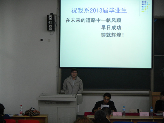 最后,甘德安常务副院长就2013年就业形势、就业技巧等给同学们做了详细的介绍和分析,以鲜活的事例诠释了对大学生活要进行合理规划的理念,同时指导同学们如何为未来就业做好充分准备。院长对毕业生提出要求:1、学会生存。拥有自信和坚定的信念,在挫折中成长。2、学会关怀。3、学会发展。并以“没有理想、没有实践就不会有成就”结束讲话。(人文社科系供稿)