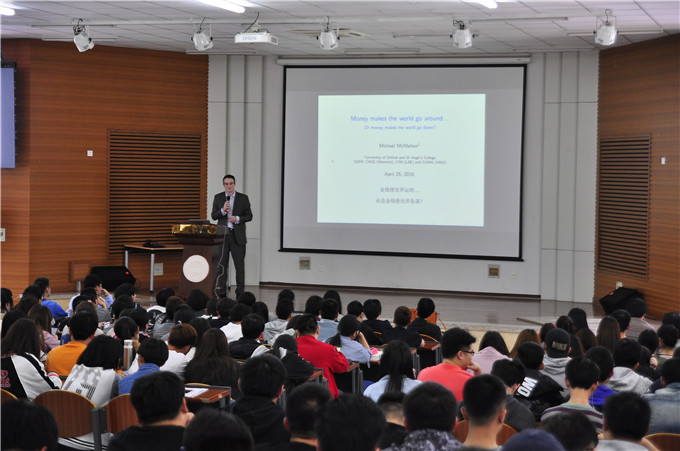 4月25日下午,英国牛津大学经济学博士Michael McMahon教授在国际交流一号报告厅对我校师生进行了主题为“Money makes the world go round?” (金钱使世界运转还是使世界堕落)的讲座,这是我校首次邀请到英国牛津大学的教授来校进行讲座。我校荣誉校长Frank McMahon教授、国际商学院潘玉庆副院长、国际交流办公室田野主任以及各院系200余名师生参加了本次讲座,国际商学院徐薇、张蕾两位老师担任本次讲座的现场翻译。