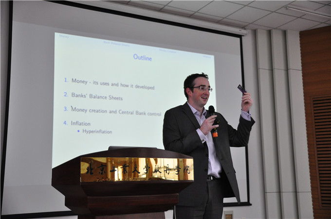 讲座一开始,Michael教授向同学们讲解了金钱的历史,指出金钱作为转换物品价值的使用,并针对金钱最原始的含义――“物物交换”举例进行说明。而后,Michael教授为同学们讲述了金钱的价值尺度、流通手段、贮藏手段、支付手段的四种功能,针对每一项功能进行具体阐述,他也对当下比较流行的比特币进行分析,并与同学们进行互动交流。接着Michael教授以非常简单易懂的方式教同学们如何读懂和计算资产负债表。最后,Michael教授讲解了通货膨胀会降低金钱的价值,并以阿根廷和津巴布韦两个国家进行实例分析,向同学们展示了津巴布韦通货膨胀后人民的生活情景,Michael教授通过结合各个国家通货膨胀的数据分析得出,制止恶性通货膨胀的方法之一就是阻止政府不再印制钞票。