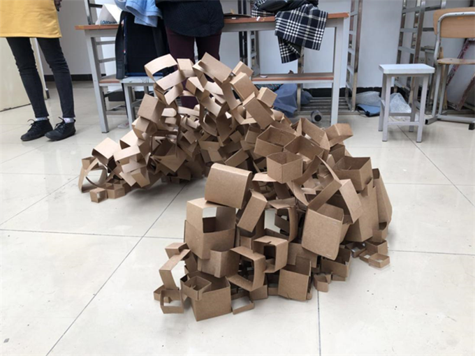 第三组的主题是“穿插”,灵感来源于“枕头”,将材料经过反复折叠和穿插进行叠高,展现出建筑设计中的连贯性。