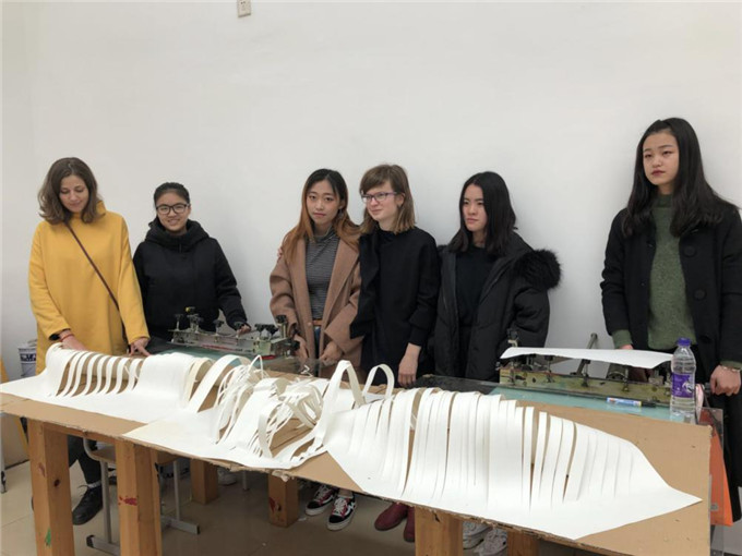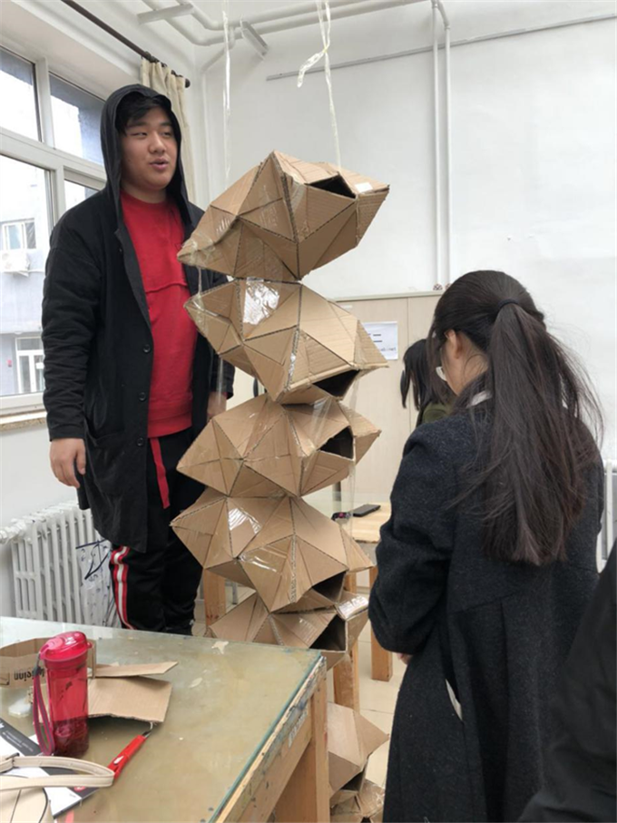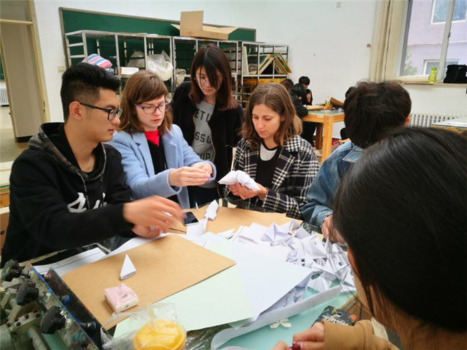 “建筑空间探索”国际工作坊由斯洛伐克国立艺术学院的Kristin Rypakova老师、Danica老师和环境设计专业教师杨帆共同指导,环境设计专业20名学生以“折纸”“剪纸”“堆叠”和“穿插”为主题和表现形式进行创作,在三天的时间小组合作完成了四个意向主题建筑模型设计。