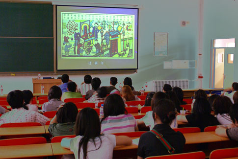 5月21下午三时,山东木版年画专家、国家工艺美术大师张殿英先生应邀,在BJ03以《山东潍县年画》为题为我院师生做了报告。