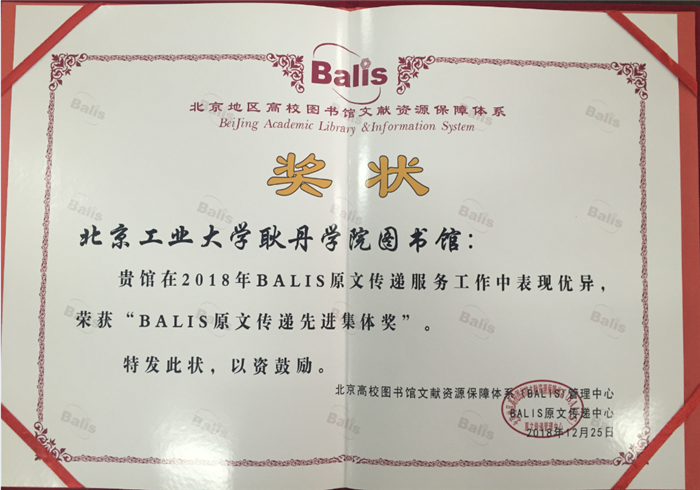 图书馆荣获2018年度北京地区高校图书馆文献资源保障体系原文传递“先进集体”