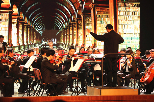 下午四点,乐团的剧务组的成员就已经来到讲堂为演出做着准备,学生志愿者们也在紧锣密鼓的筹备,做着最后的准备。随着时间的推移,乐团成员们也相继来到讲堂。提琴、定音鼓、竖琴各种乐器被搬上场,在灯光与乐器的相互衬托下,讲堂的舞台油然生出一种音乐殿堂的气息,这气息神圣令人神往,即使在开场前也强烈的吸引着师生的眼球。
