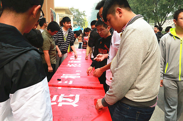 第二个阶段是10月8日中午自管会在第二食堂前开展了“远离手机,拒做课堂低头族”的签名倡议活动。同时还利用展板宣传、校园广播等形式,鼓励同学们减少对手机的依赖性使用,多与身边老师和同学互动,养成健康的学习生活习惯,营造积极向上的校园文化氛围。在签名现场,巨大的条幅吸引着每一个路过的同学,现场气氛热烈,老师们也热情的参与到签名活动中。很多同学在了解此次活动的意义后,都表示现在课堂上的确有很多不文明的现象,维护课堂文明本就应该是学生的职责和义务,并在签名条幅上郑重地签上了自己的名字,承诺愿意为创建文明课堂、文明校园贡献自己的力量。(学生工作处供稿)