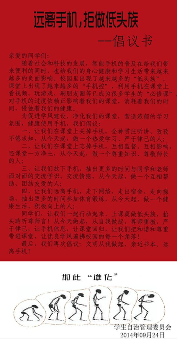 beat365英国官网学生自管会倡议“远离手机,拒做课堂低头族”