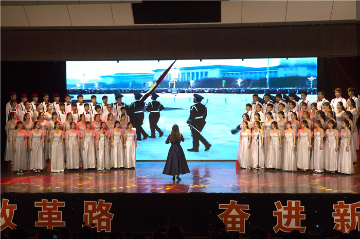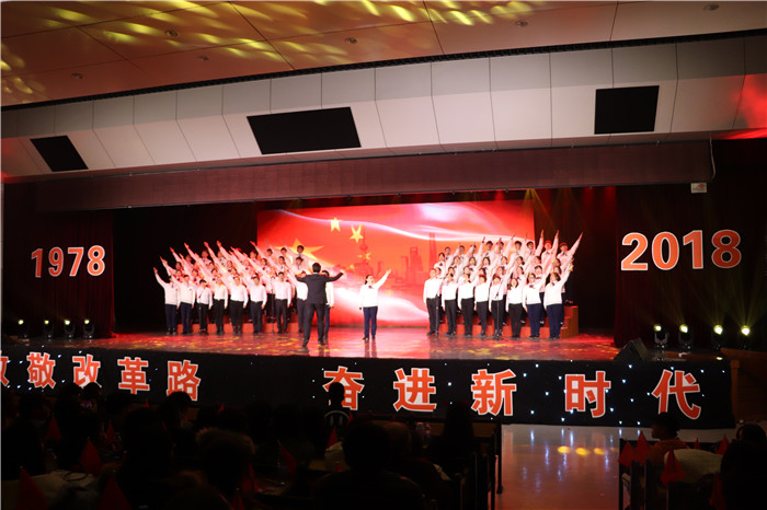 当晚的耿丹讲堂华灯璀璨,洋溢着浓浓的节日气氛。 舞台中央“致敬改革路 奋进新时代”几个大字遒劲有力。钟声鸣响,大幕开启。晚会以磅礴气势和精美艺术将改革开放四十年以来,中国人民的奋斗史浓缩在表演中,展现了中华民族在苦难中崛起、在拼搏中前进的光辉历程,集中描述了在党中央几代领导集体和以习近平同志为总书记的党中央领导下我国发生的历史性巨变,热情讴歌了我国各族人民自强不息、顽强奋进的精神风貌,深刻诠释了只有改革开放才能发展中国、发展社会主义的主题。