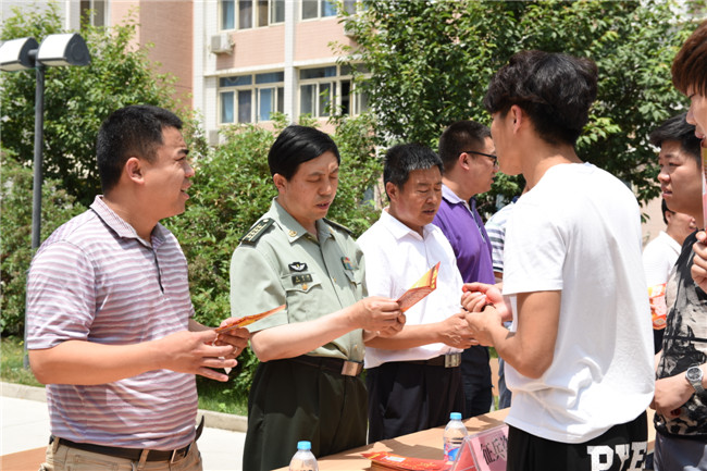 活动主宣传点设在学生宿舍楼1号楼与2号楼之间,上午10点30分,宣传现场聚集了很多前来咨询的学生。在近两个小时的宣传活动中,院领导与武装部的同志耐心细致地解答同学们提出的各种问题,宣传大学生应征入伍对国防建设的意义,详细讲解今年夏季征兵的各种优待政策及征兵形式,并向同学们进行爱国主义教育和《兵役法》、《国防法》等相关方面的普法宣传。