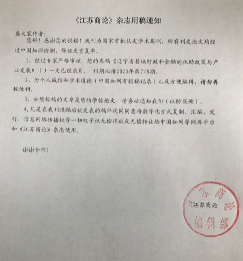 The article titled Financial Support Policy and Industrial Development in Counties in Liaoning Province written by Professor Sheng Dachen of Financial Engineering majors have been accepted by a academic journal titled Jiangsu Business Forum(translated) and will be published next year according to its schedule.The other two articles are graduation thesis written by Wang Zhipeng and Liu Jiawei respectively, both majoring in Financial Engineering and guided by Professor Sheng Dachen. They will be published on Bohai Rim Economic Outlook(translated) and Special Zone Economy respectively, .