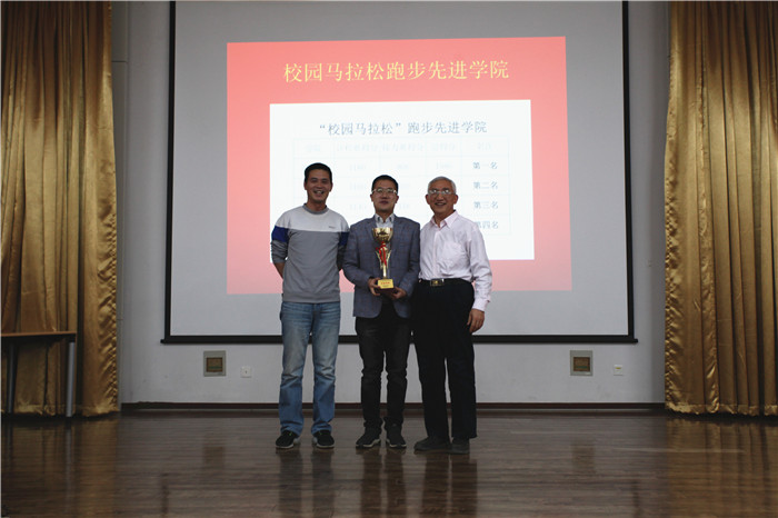 我院体育教学部在会议结束时还特别举行了“2018耿丹校园马拉松颁奖典礼”,国际商学院以第一名的成绩荣获“校园马拉松”跑步先进学院,丁晓良常务副院长为其颁发奖杯,鼓励先进。