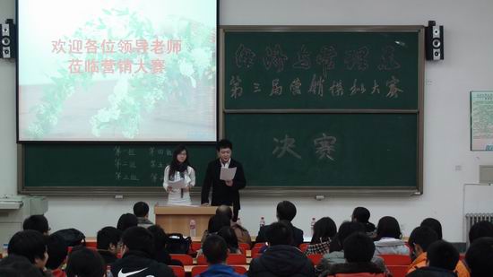 本次比赛营销对象为“北京台湾街”,进入决赛的选手共有六组,评委根据“营销内容”、“营销创意”、“营销技巧”、“仪表仪态”与“综合素质”等五个方面对选手进行评分。比赛中,选手们围绕“北京台湾街”这条特色街道进行了生动而又具体的描述。最后,孙乐带领的第三组“佳和乐”组合以精彩的设计和学以致用的充分阐述夺得本次大赛的冠军。评委对此次营销模拟大赛进行了点评并为获奖团队颁奖。