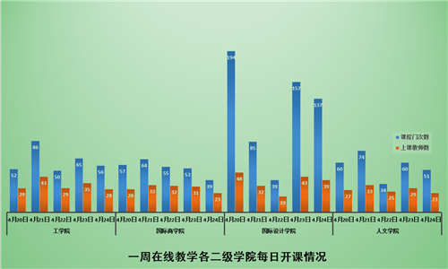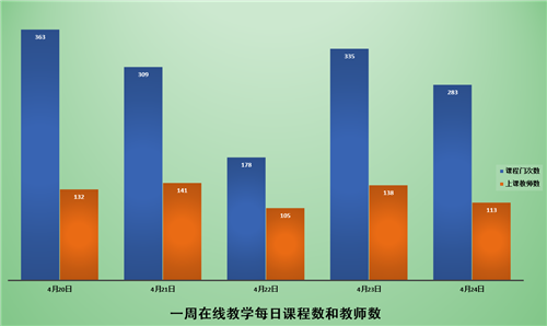 4月20日至4月24日期间,共有在线教学课程260门、1468门次;共有同学46148人次上课;共有194位教师进行了在线教学。学校积极落实了在线教学第九周对同学“全覆盖”的要求,基本保证同学每天在线学习。