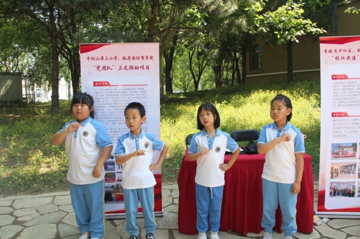 在国际商学院特色展区,学院与牛山三小共建项目的成果展示吸引众多居民驻足。小学生们表演的手势舞、社区共建图片展等,生动呈现了校社联动的丰硕成果。