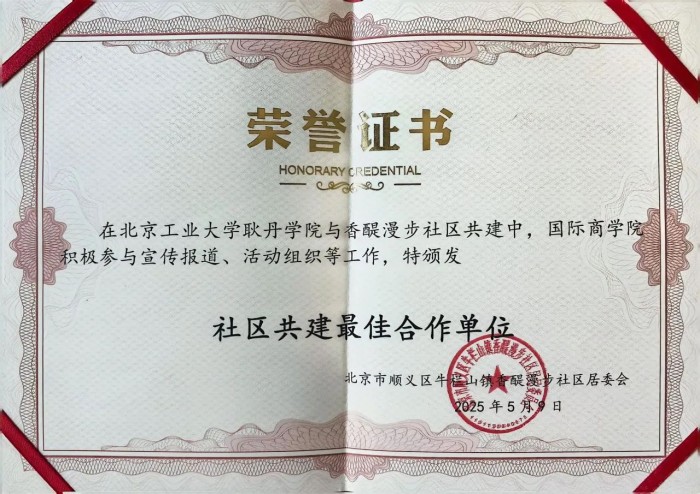 在beat365英国官网与香醍漫步社区共建中,国际商学院积极参与宣传报道、活动组织等,北京市顺义区牛栏山镇香醍漫步社区居民委员会授予国际商学院“社区共建最佳合作单位。