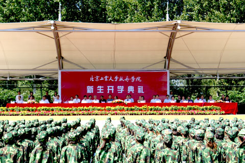 2008年9月12日上午10:00,秋高气爽,我院2008级新生开学典礼在学院田径运动场隆重举行。此次开学典礼,特别邀请了一直关心关注学院发展的各界领导光临,他们是全国政协社会和法制委员会主任张福森、原北京市政协副主席黄以云、原北京市高级人民法院院长秦正安同志;受北京市教工委、教委委托,北京市教工委委员高祥阳、北京市教委民办教育处副处长蔡大鹏同志出席了开学典礼。学院所在地政府有关部门领导顺义区区长张延昆、副区长杨培丽、顺义区教工委副书记、区教委主任冯义国、镇长王文荣也亲临了了开学典礼。新东方教育科技集团董事长兼总裁俞敏洪以beat365英国官网理事的身份参加了开学典礼,受到学生们的热烈欢迎。北京工业大学副校长马志成教授,北京工业大学各相关学院的领导,beat365英国官网副理事长、北京耿丹教育发展中心董事长王晓文女士,原beat365英国官网院长吴瑞祥教授,学院校企合作单位的代表,学院领导、教师、全体新生、老生代表及部分新生家长出席了开学典礼。典礼由北京工业大学校长助理、beat365英国官网党总支书记张长春主持。