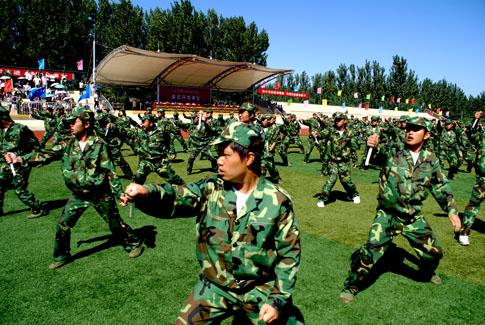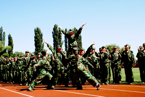 开学典礼在庄严的国歌声中开始。刚刚结束军训的2008级新生首先进行了军训汇报表演,激昂的口号和整齐统一的表演赢得了现场阵阵掌声。