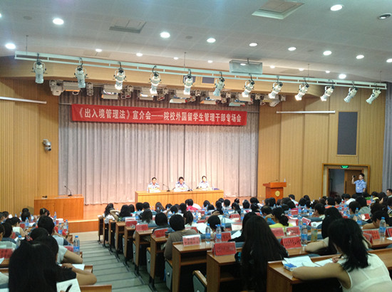 本次会议由北京市公安局出入境管理总队召开,主要内容:一是对即将于9月1日颁布的新《出入境管理法》进行宣介和解释,二是对前一阶段工作的情况进行通报,三是对本学期的工作提出具体要求。