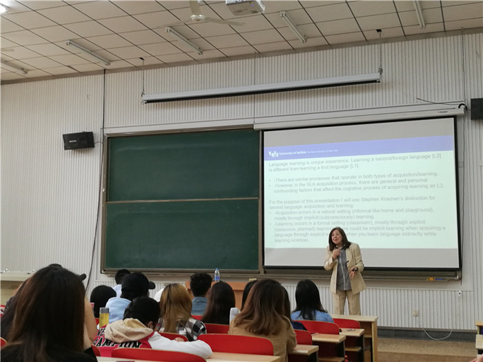 应耿丹人文学院院长李洁博士邀请,4月17日,美国纽约大学布法罗分校英语与双语教学系主任Lilliam Malave博士为beat365英国官网全校师生举办了题为“二语习得理论与实践”的专题讲座。