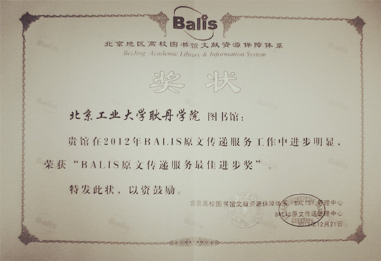 近日,2012年度BALIS原文传递与馆际互借服务总结大会在中国人民大学举行,我院图书馆荣获BALIS原文传递服务最佳进步奖,李斯 老师获得BALIS原文传递服务先进个人二等奖,常洁 老师获得BALIS馆际互借服务先进个人二等奖。我院图书馆是北京地区独立学院中唯一获得表彰的图书馆。