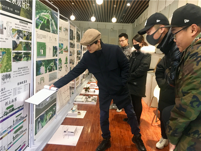 展览当天,学生展示了设计图纸与手工模型,老师们进行现场评图并打分。“壶中天地”的设计主题意在有限的庭院空间中营造出休闲雅致同时与建筑风格和谐统一的庭院景观,同学们在设计过程中紧密围绕设计主题,尝试采用多元的设计元素得以凸显。本次课程对大二年级学生的计算机软件的辅助表达也提出了较高的要求。